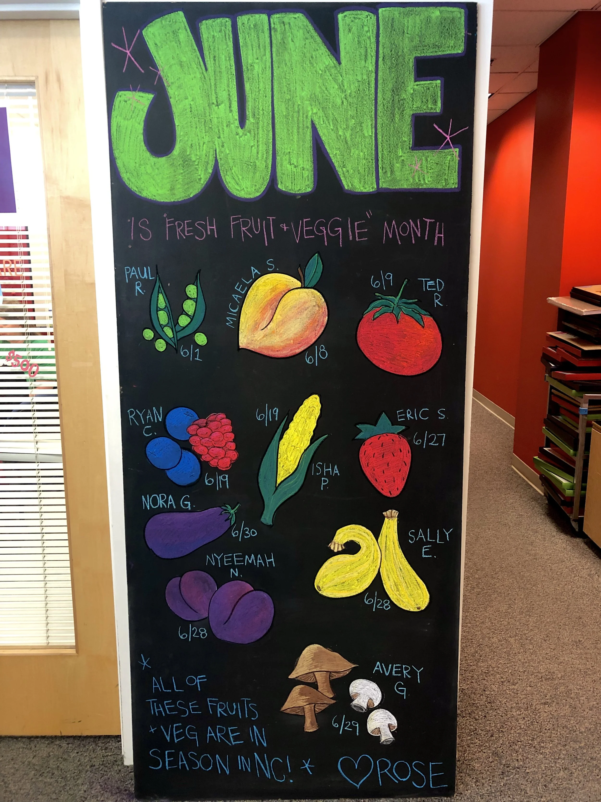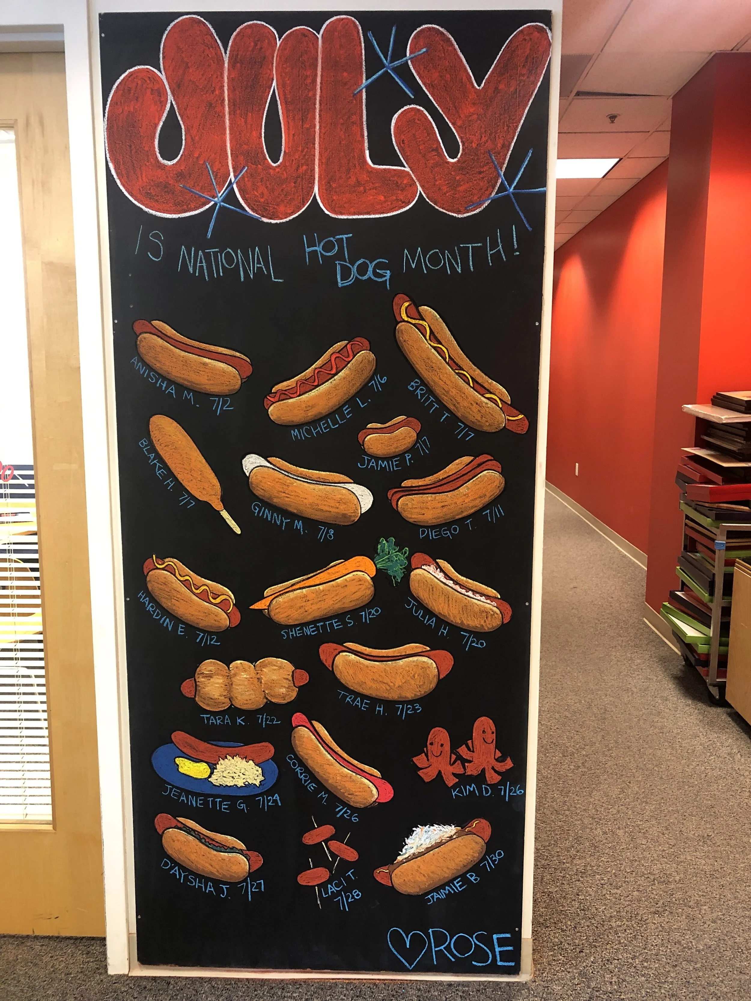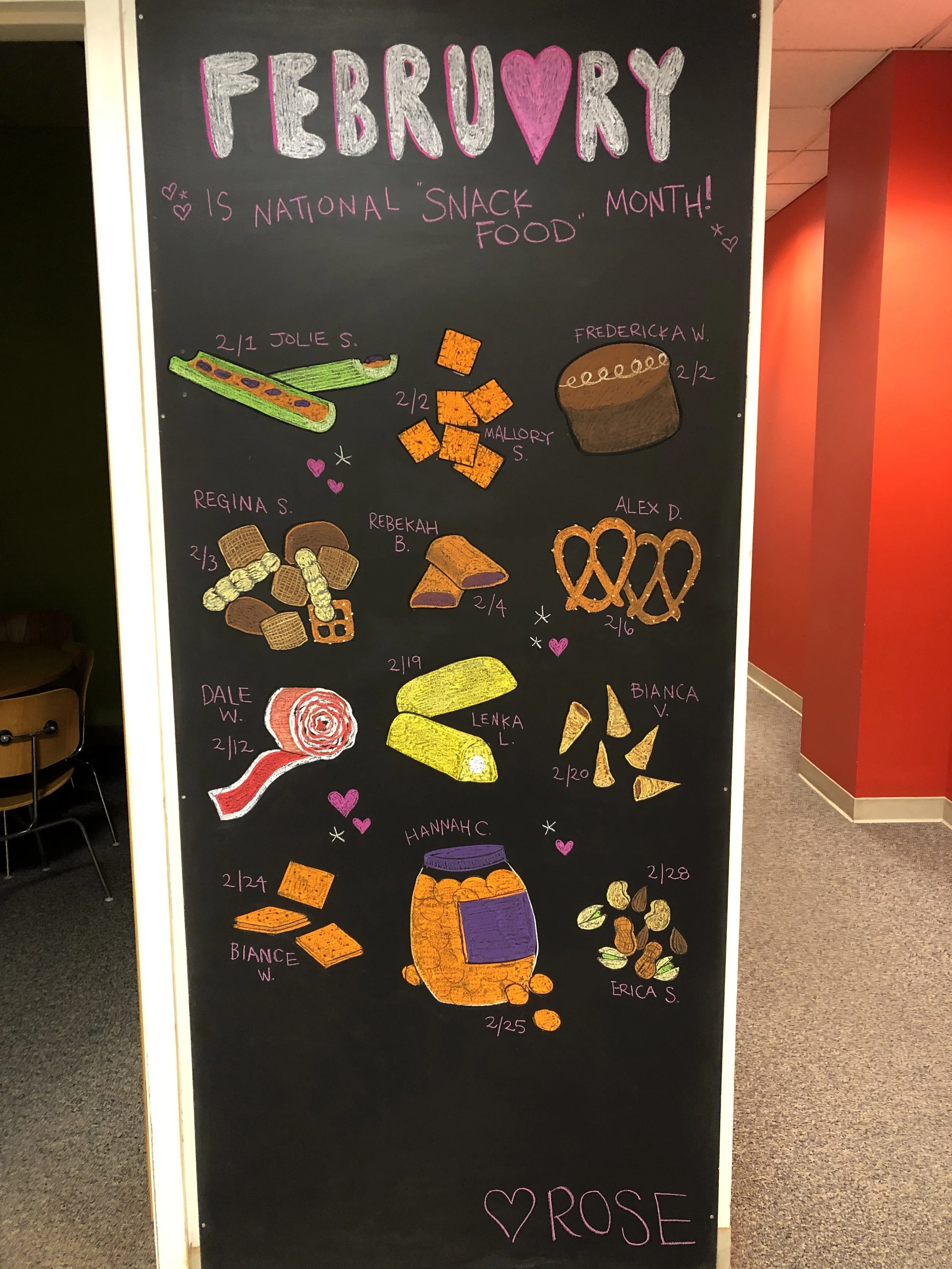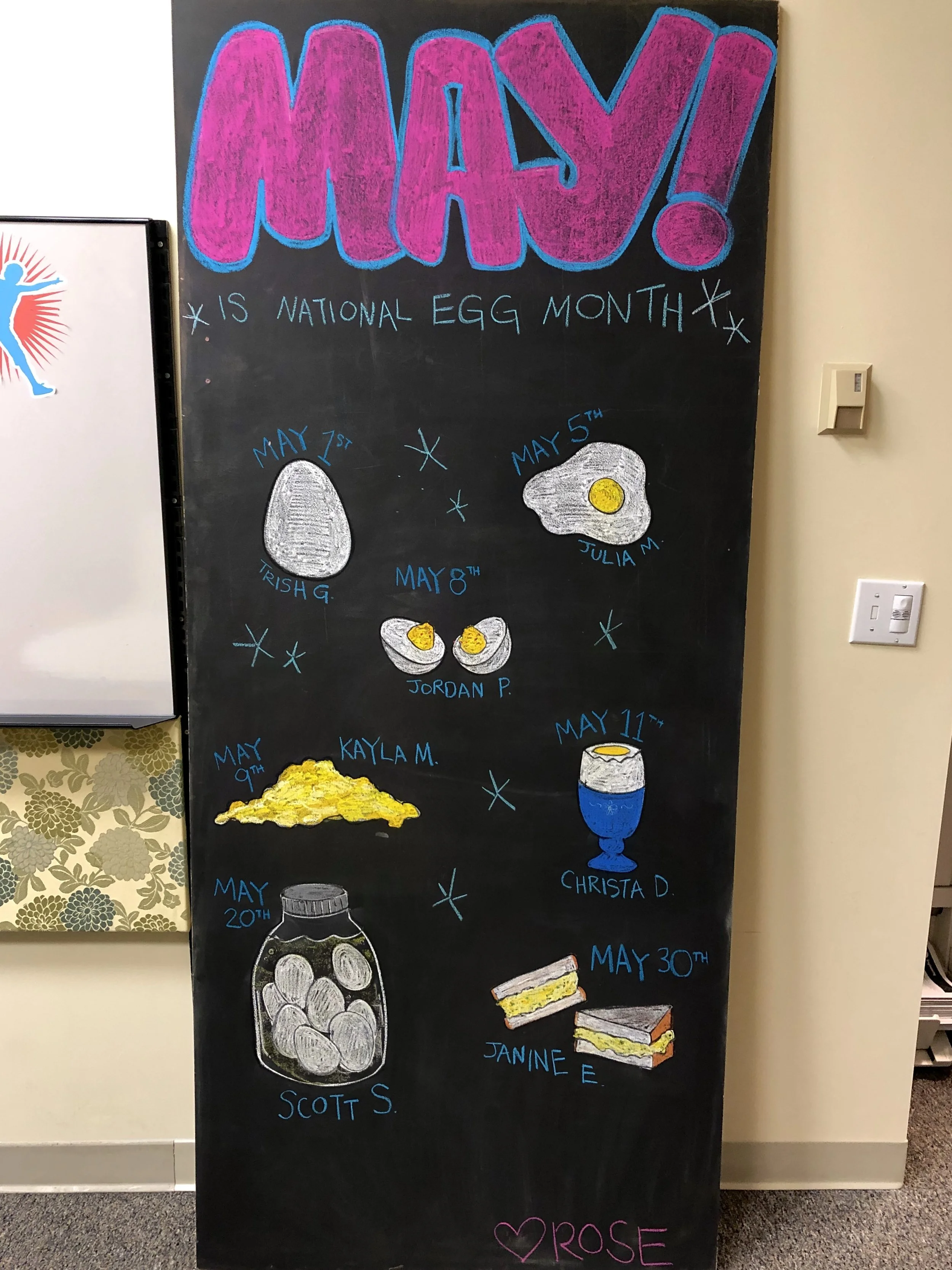 pastel chalk boards featuring staff birthdays - every month had a theme, either related to holidays or a national monthly observation